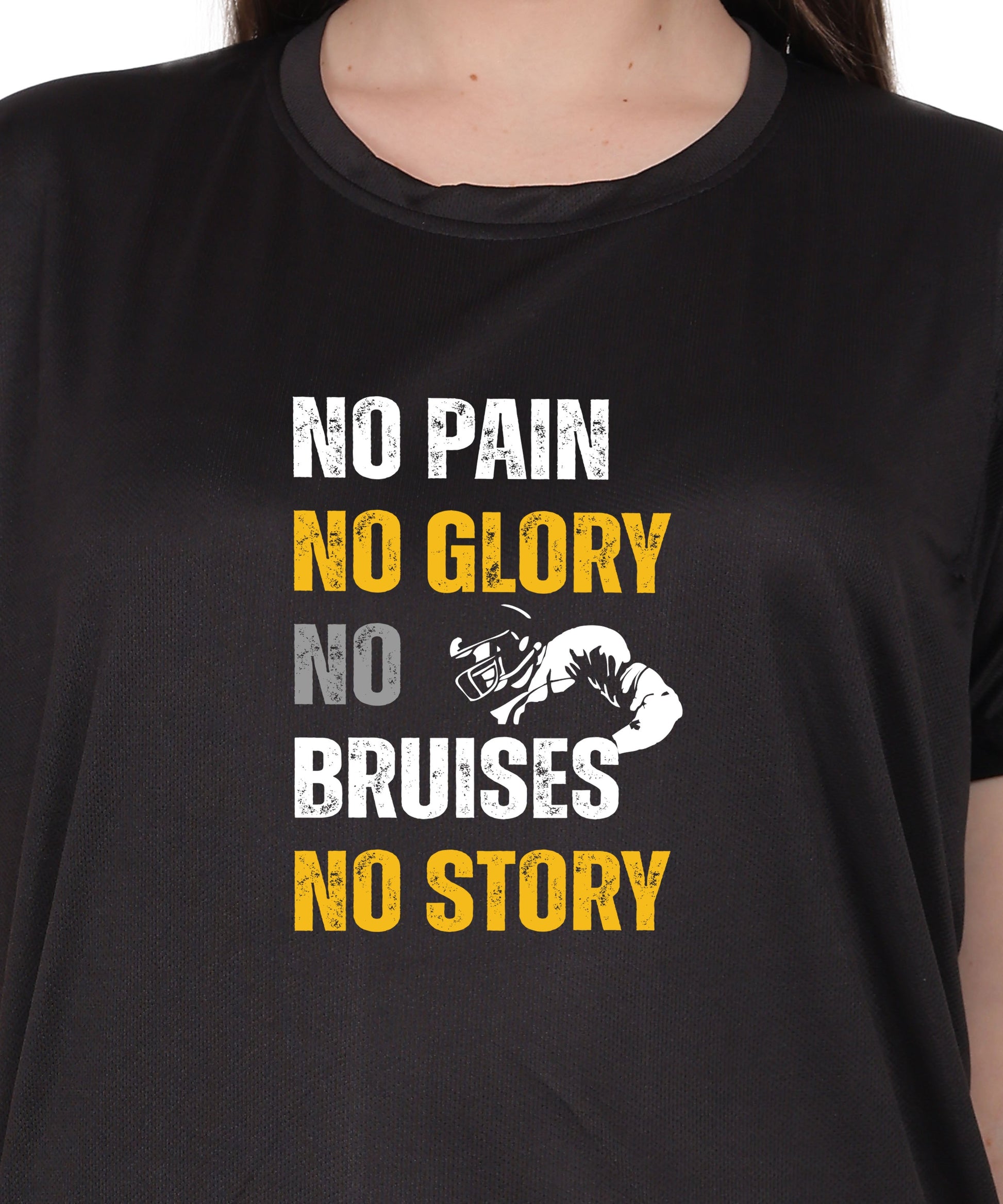 Make a bold statement with this eye-catching red t-shirt featuring the powerful message 'No Pain No Glory No Bruises No Story' alongside striking graphics. Perfect for athletes and sports enthusiasts, this regular fit t-shirt combines style with comfort. The screen-printed design stands out in white, yellow, and gray text against the vibrant red background, creating an impactful visual statement. Crafted from a cotton blend material, this short-sleeve crew neck shirt offers breathable comfort for both active wear and casual occasions. The classic straight hemline and ribbed collar ensure a clean, polished look that pairs easily with jeans, shorts, or athletic wear. The lightweight construction makes it ideal for summer activities, while the durable fabric maintains its shape through regular machine washing. Whether you're heading to practice, the gym, or just showing off your athletic spirit, this t-shirt delivers both comfort and attitude. The versatile design works well for various sports activities while making a memorable impression with its motivational message.